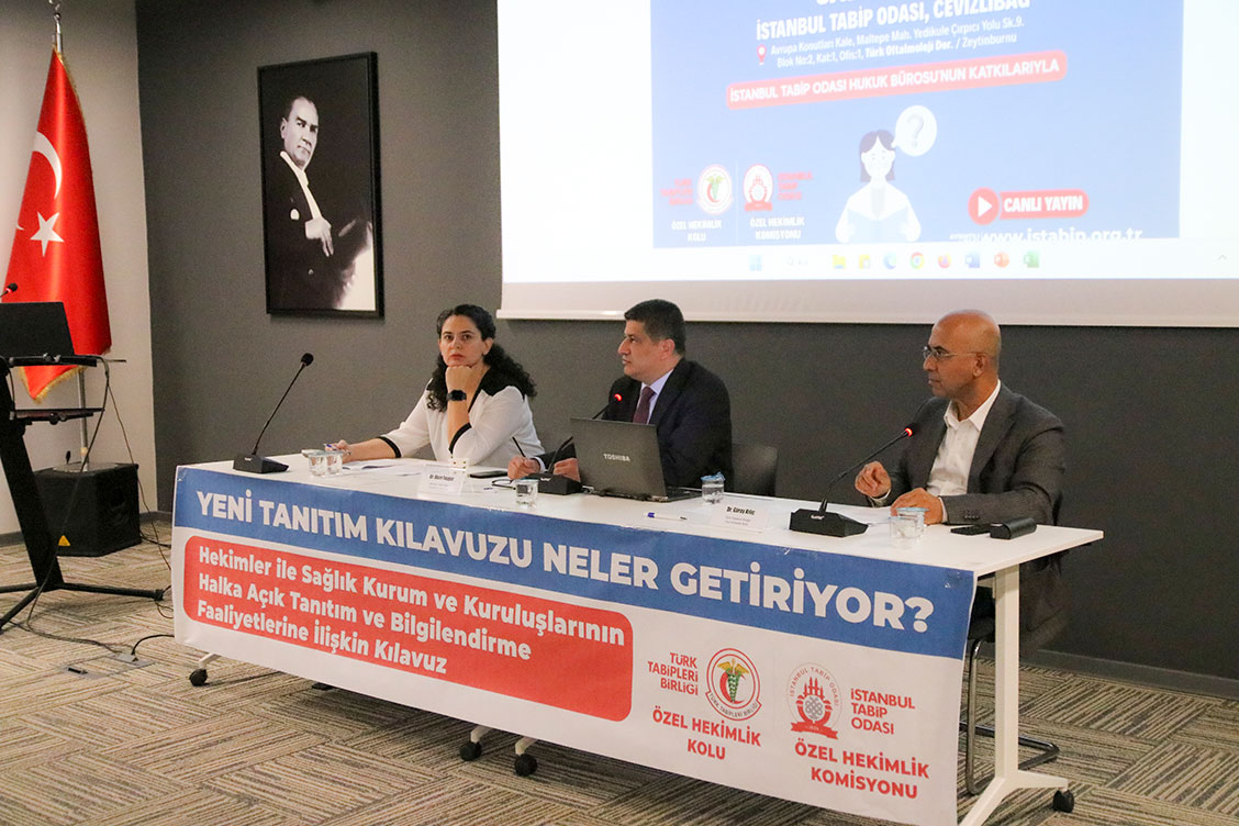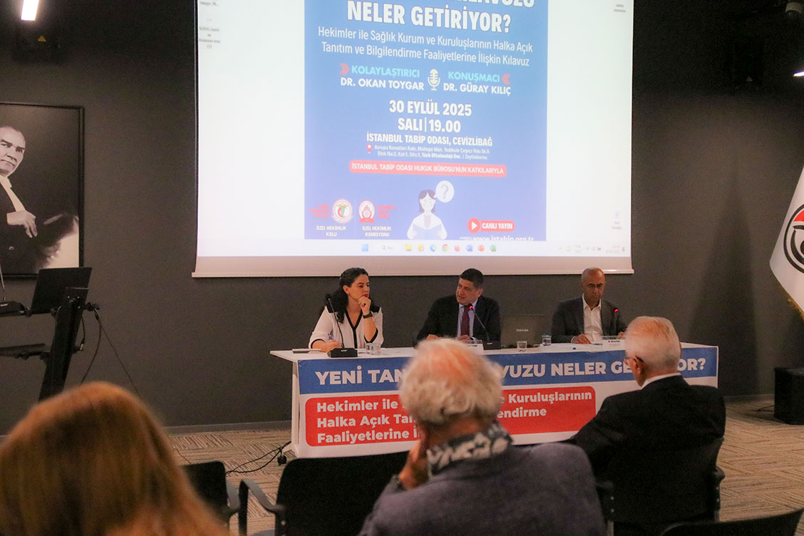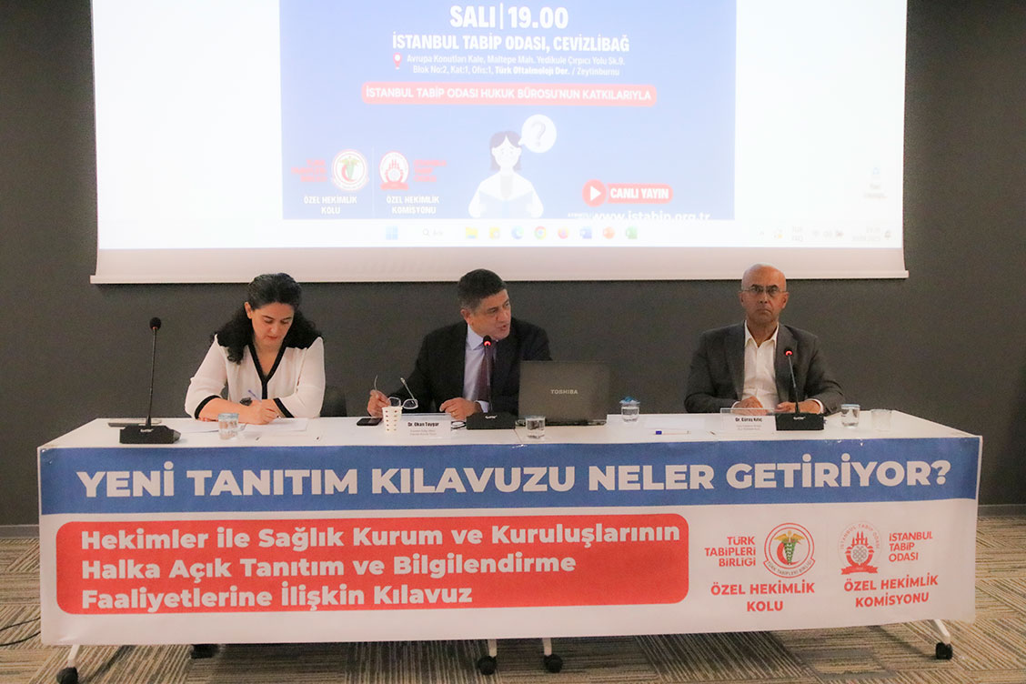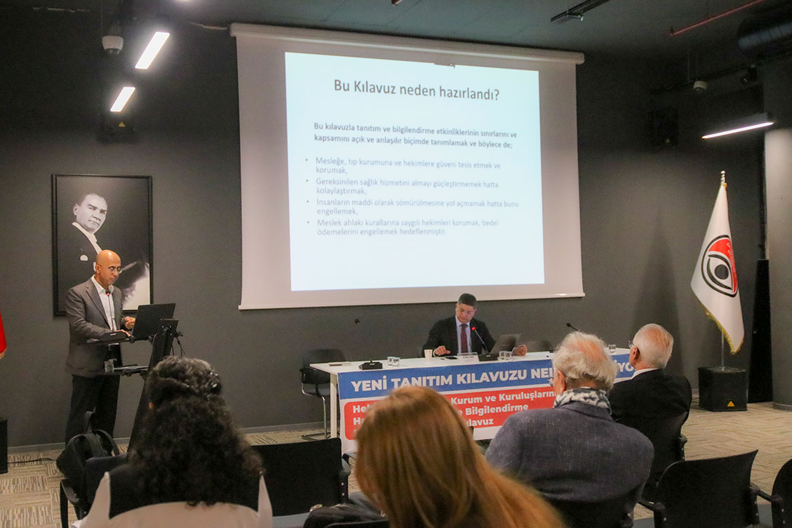 Türk Tabipleri Birliği (TTB) Özel Hekimlik Kolu ve İstanbul Tabip Odası (İTO) Özel Hekimlik Komisyonu tarafından düzenlenen “Hekimler ile Sağlık Kurum ve Kuruluşlarının Halka Açık Tanıtım ve Bilgilendirme Faaliyetlerine İlişkin Kılavuz” hakkında meslektaşlarımızın bilgilendirildiği ve yeni kılavuzun getirdikleriyle ilgili karşılıklı fikir alışverişinin yapıldığı “Yeni Tanıtım Kılavuzu Neler Getiriyor?” başlıklı toplantı 30 Eylül 2025 tarihinde, İTO’nun Cevizlibağ’daki merkez bürosunda yapıldı.