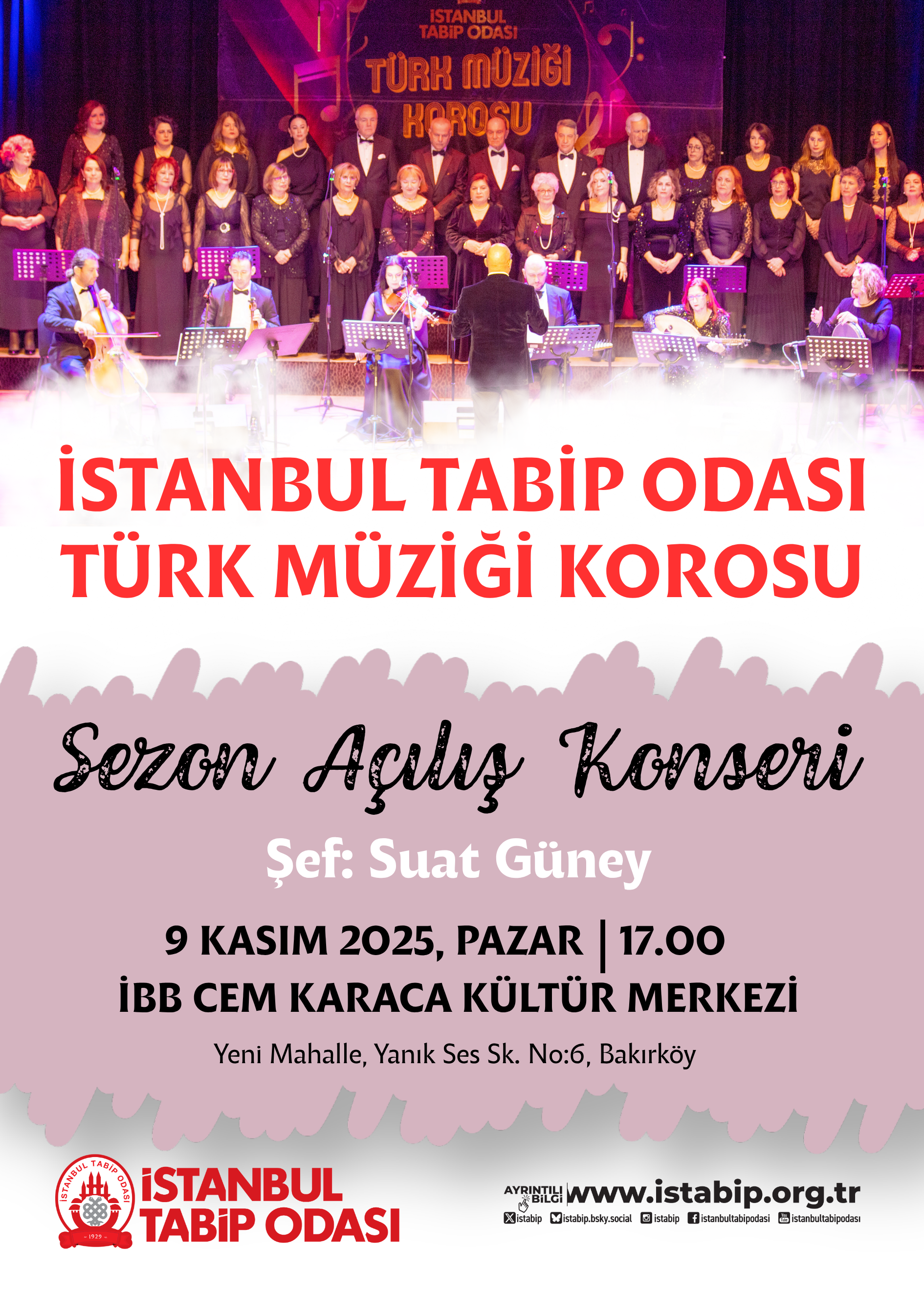 İstanbul Tabip Odası üyesi hekimlerden kurulu Türk Sanat Müziği Korosu 9 Kasım 2025 Pazar günü, Bakırköy İBB Cem Karaca Kültür Merkezi’nde sahne alıyor. Saat 17.00’de başlayacak sezon açılış konserimize katılımınızı bekleriz.