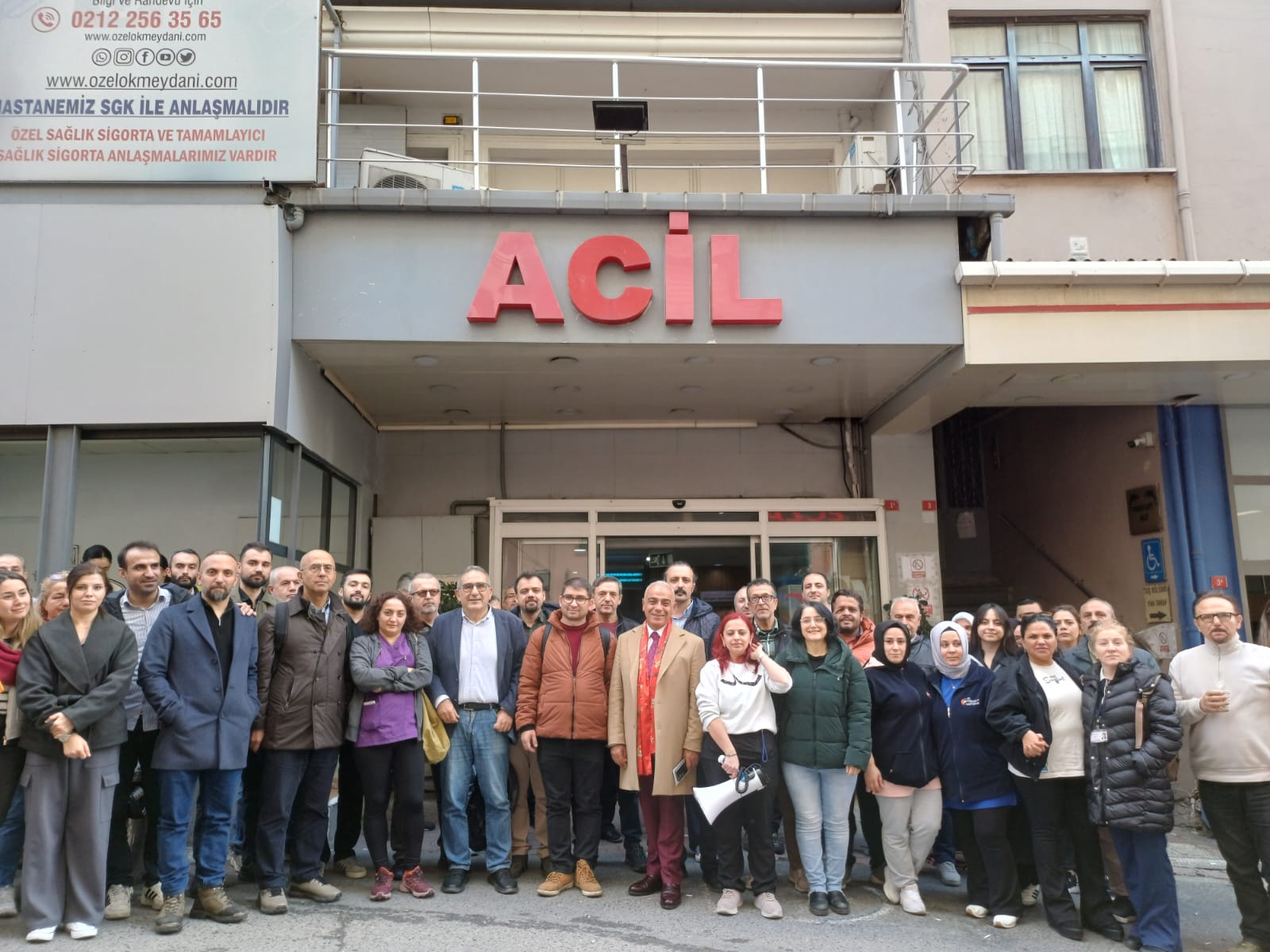 Şafak Grubu’na ait Özel Okmeydanı Hastanesi’nde 200’e yakın sağlık çalışanı ve hekim “depreme dayanıksız bina” gerekçe gösterilerek birikmiş alacakları ve yasal tazminatları ödenmeden işsiz bırakıldı. İstanbul Tabip Odası (İTO) hastane önünde direniş başlatan sağlık emekçilerini 13 Kasım 2025 tarihinde ziyaret etti.