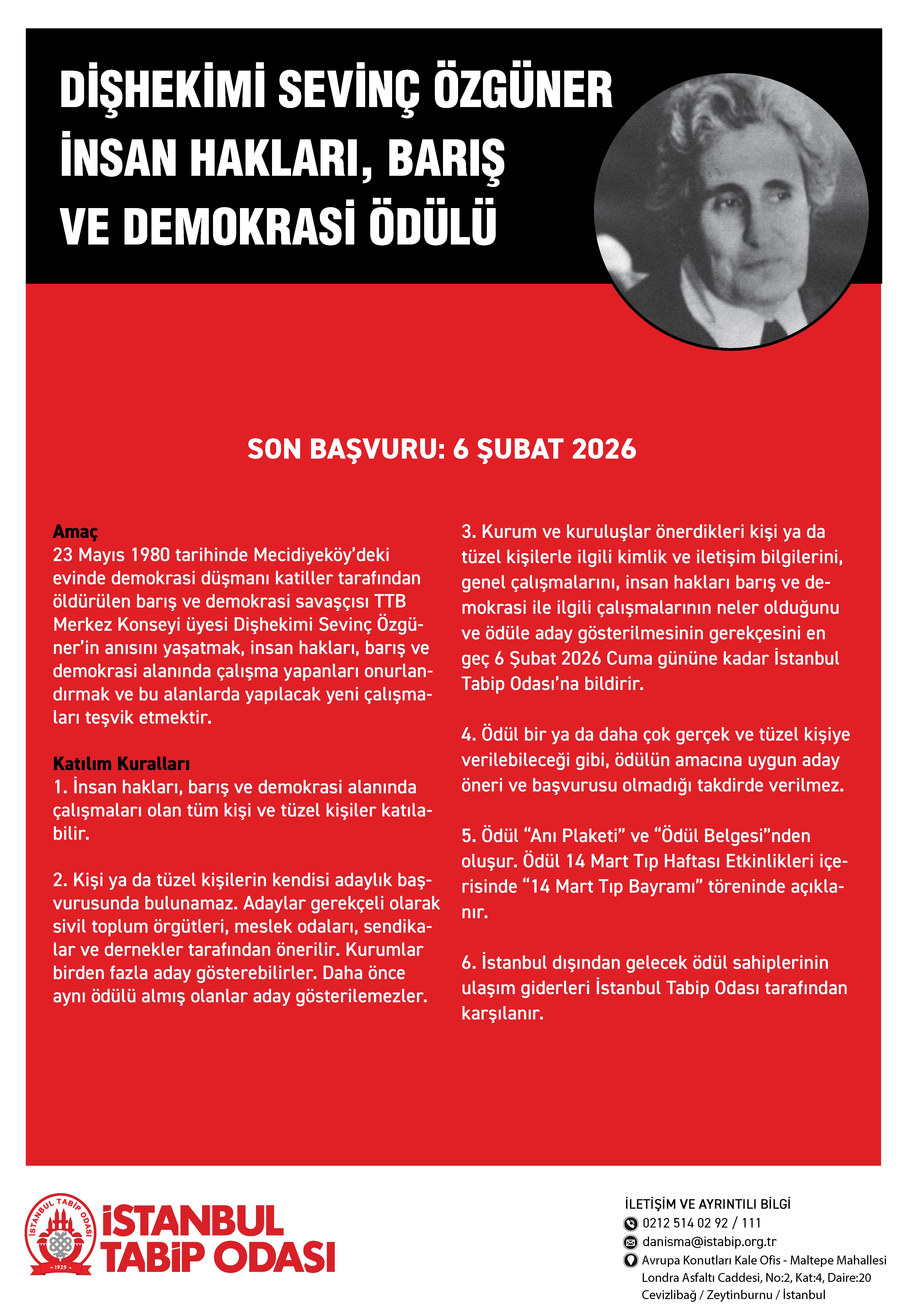 Söz konusu ödül her yıl olduğu gibi 2026 yılında da 14 Mart Tıp Haftası etkinlikleri kapsamında verilecektir. Kurumunuzun bu konudaki ilgisinin, gerek Dişhekimi Sevinç Özgüner’in anısını yaşatmak gerekse insan hakları ve demokrasi alanında yapılan çalışmaları teşvik etmek açısından büyük önem taşıdığına inanmaktayız.