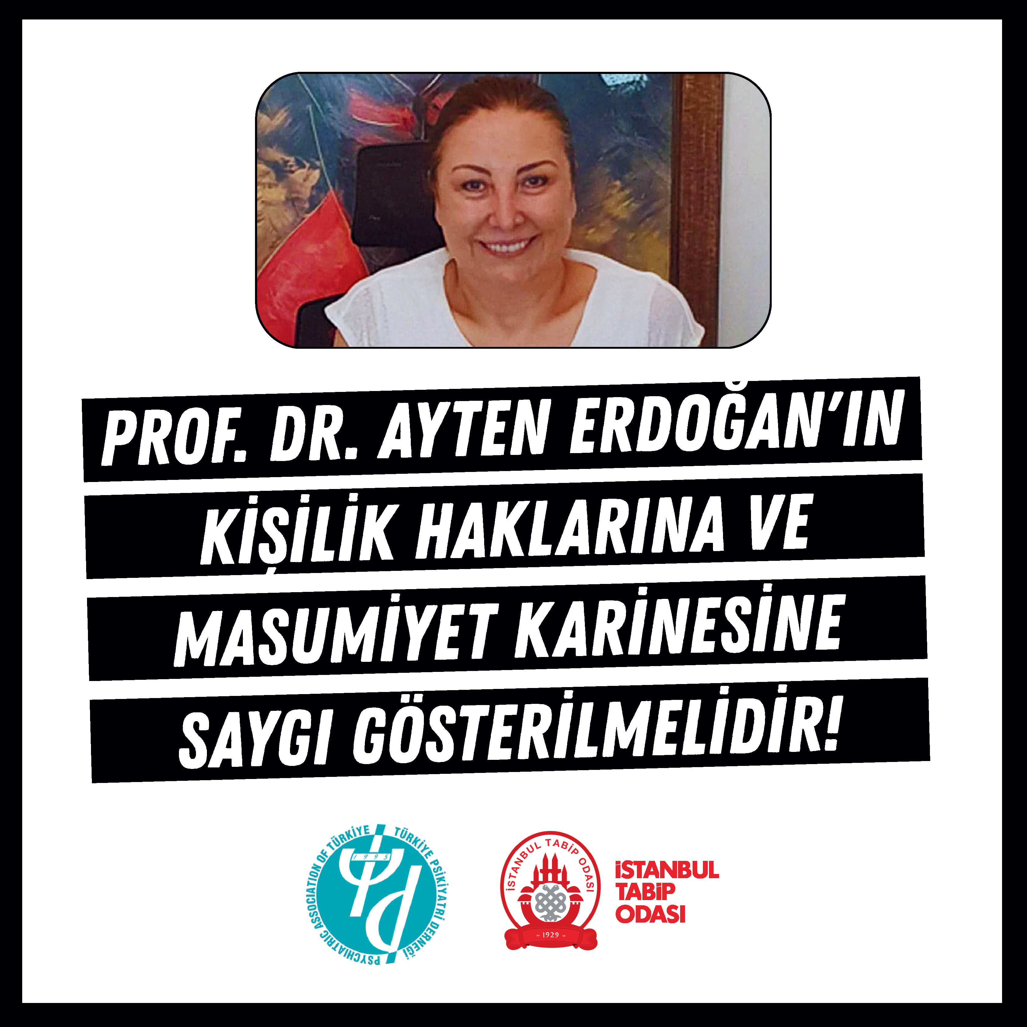 Meslektaşımız Prof.Dr. Ayten Erdoğan ile ilgili son günlerde basında yer alan haberleri ve yaşanılan adli süreci üzüntü ve endişe ile izlemekteyiz. Meslektaşımızın masumiyet karinesi zedelenerek ve lekelenmeme hakkı yok sayılarak bazı basın araçlarında yer alma şeklinin de halkın gerçek bilgiye ulaşma hakkı ile ilgili olmadığı kanısındayız.