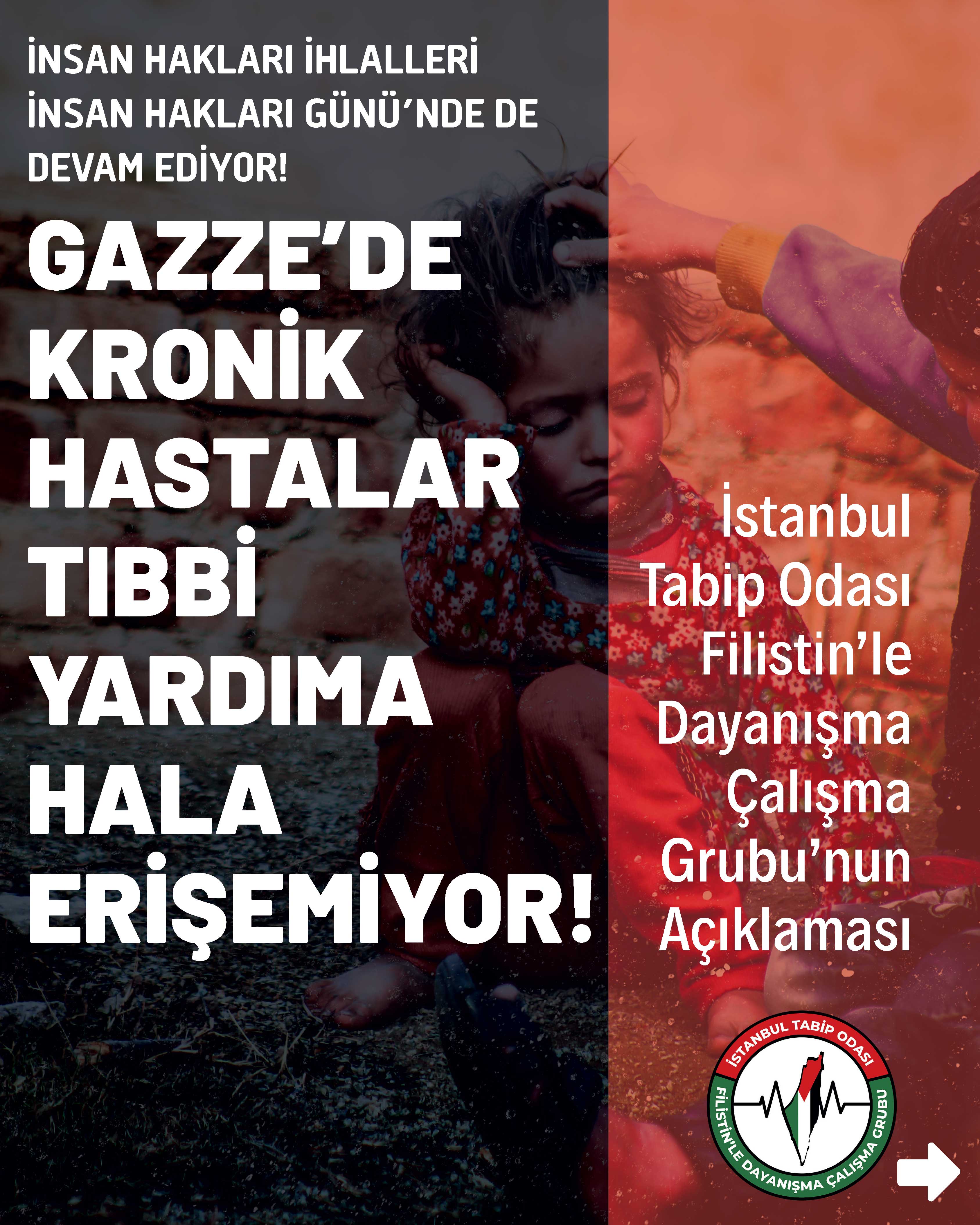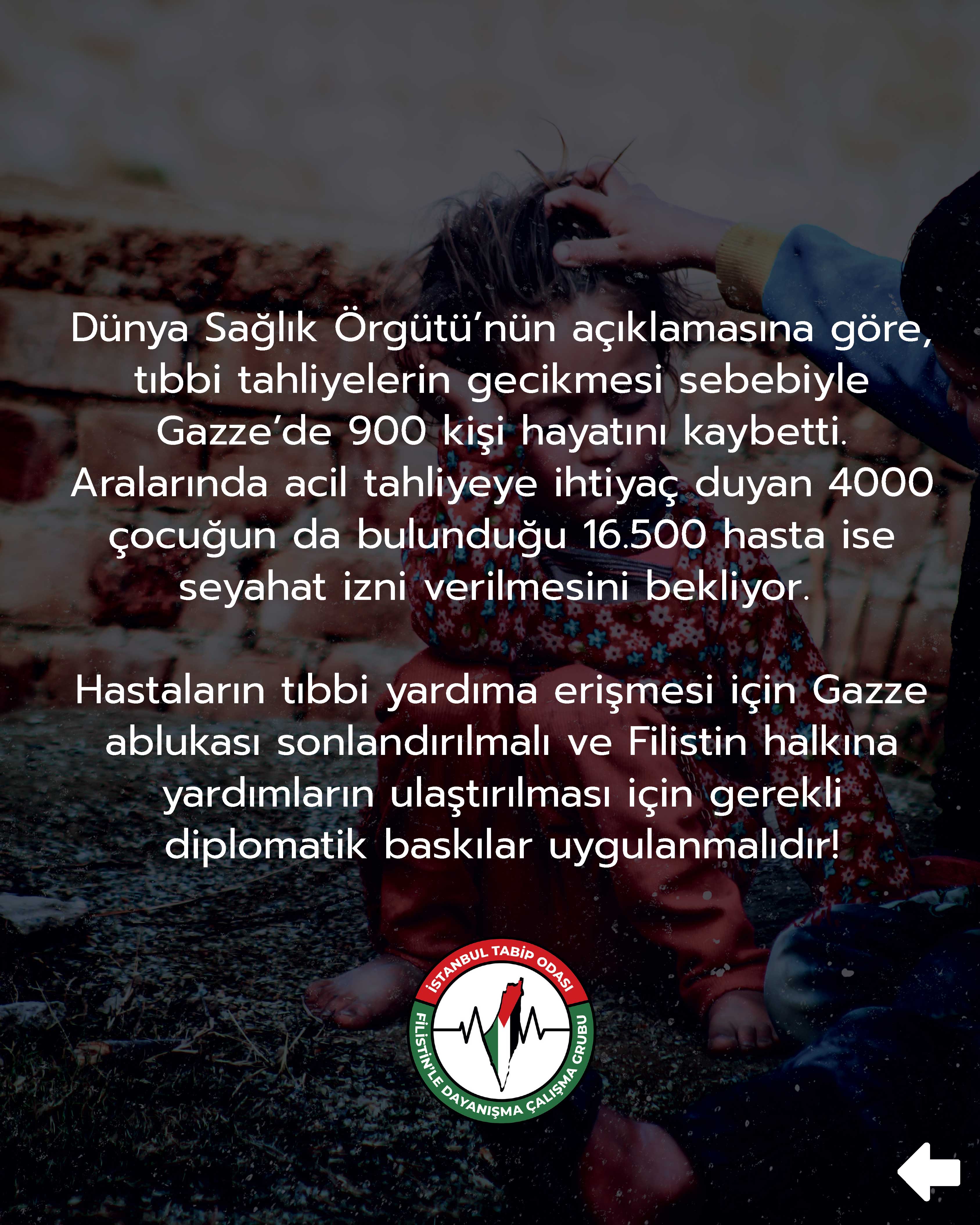 Hastaların tıbbi yardıma erişmesi için Gazze ablukası sonlandırılmalı ve Filistin halkına yardımların ulaştırılması için gerekli diplomatik baskılar uygulanmalıdır!