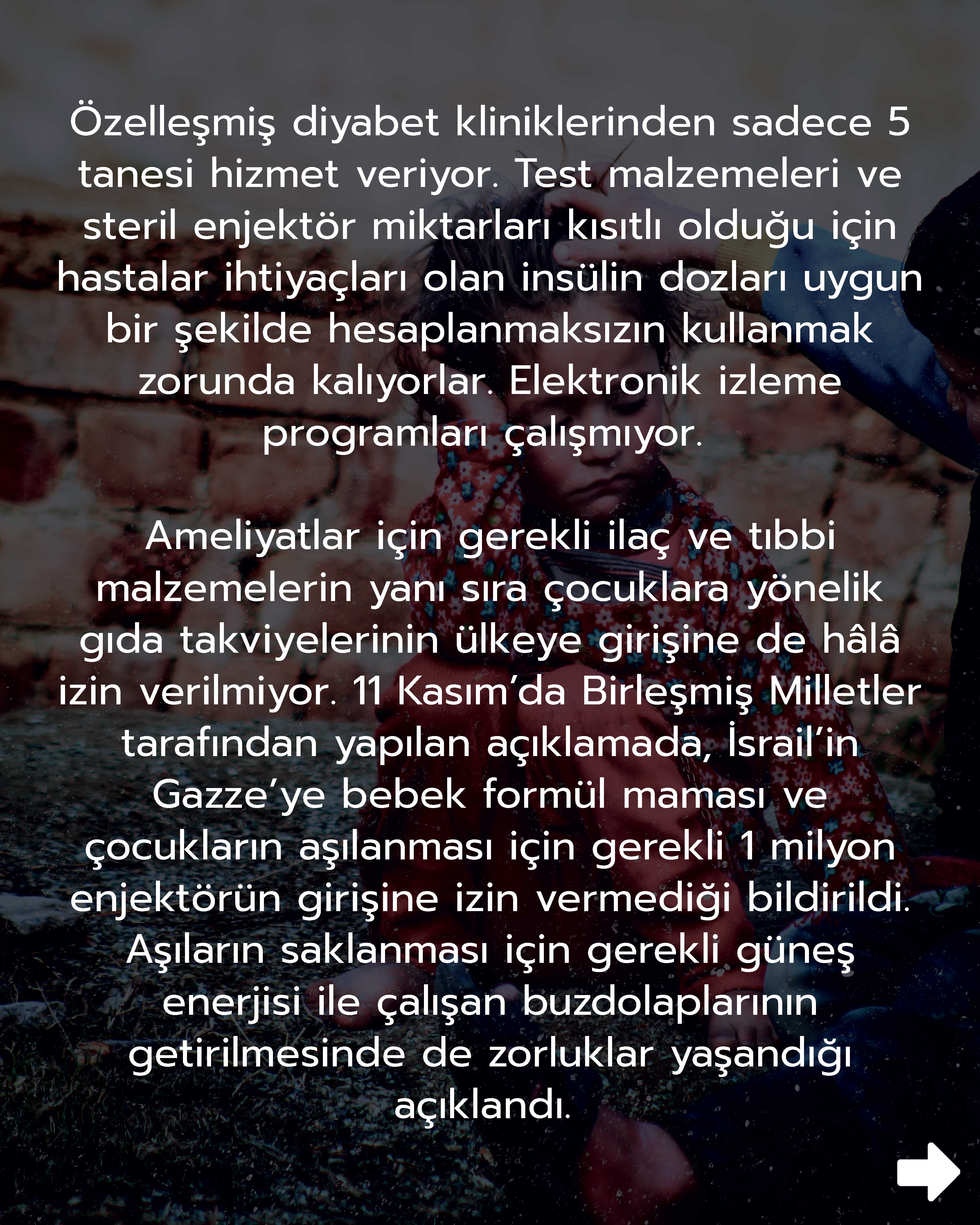 Gazze’de ateşkes anlaşması yapılmış olsa da Filistinlilere İsrail tarafından uygulanan baskı, şiddet ve mahrum bırakma politikaları Gazze üzerindeki abluka ile devam ediyor. Diyabet, hipertansiyon gibi kronik hastalıkları bulunan yaklaşık 350 bin hasta tedaviye hâlâ ulaşamıyor. Gazze’de 60.000’in üzerinde diyabet hastasının hayatları tehlike altında olmaya devam ediyor. İnsülin stokları tükenmek üzere, yakıt girişinin kısıtlanmasından kaynaklanan elektrik kesintileri nedeniyle mevcut insülinler uygun koşullarda saklanamıyor ve diyabet hastalarının ne yazık ki bu ilaçları kullanmak dışında bir seçenekleri yok.