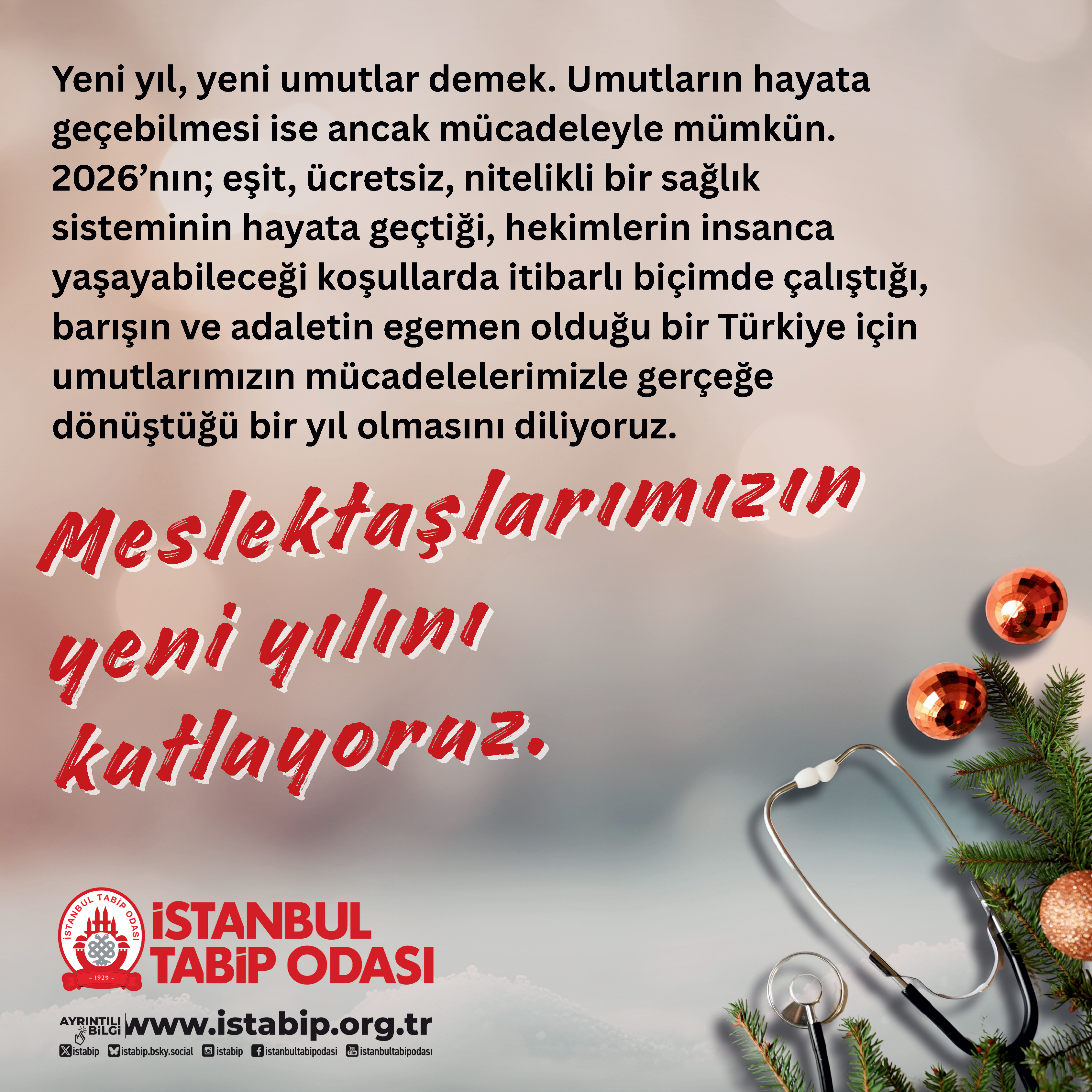 2026’nın; eşit, ücretsiz, nitelikli bir sağlık sisteminin hayata geçtiği, hekimlerin insanca yaşayabileceği koşullarda itibarlı biçimde çalıştığı, barışın ve adaletin egemen olduğu bir Türkiye için umutlarımızın mücadelelerimizle gerçeğe dönüştüğü bir yıl olmasını diliyoruz.