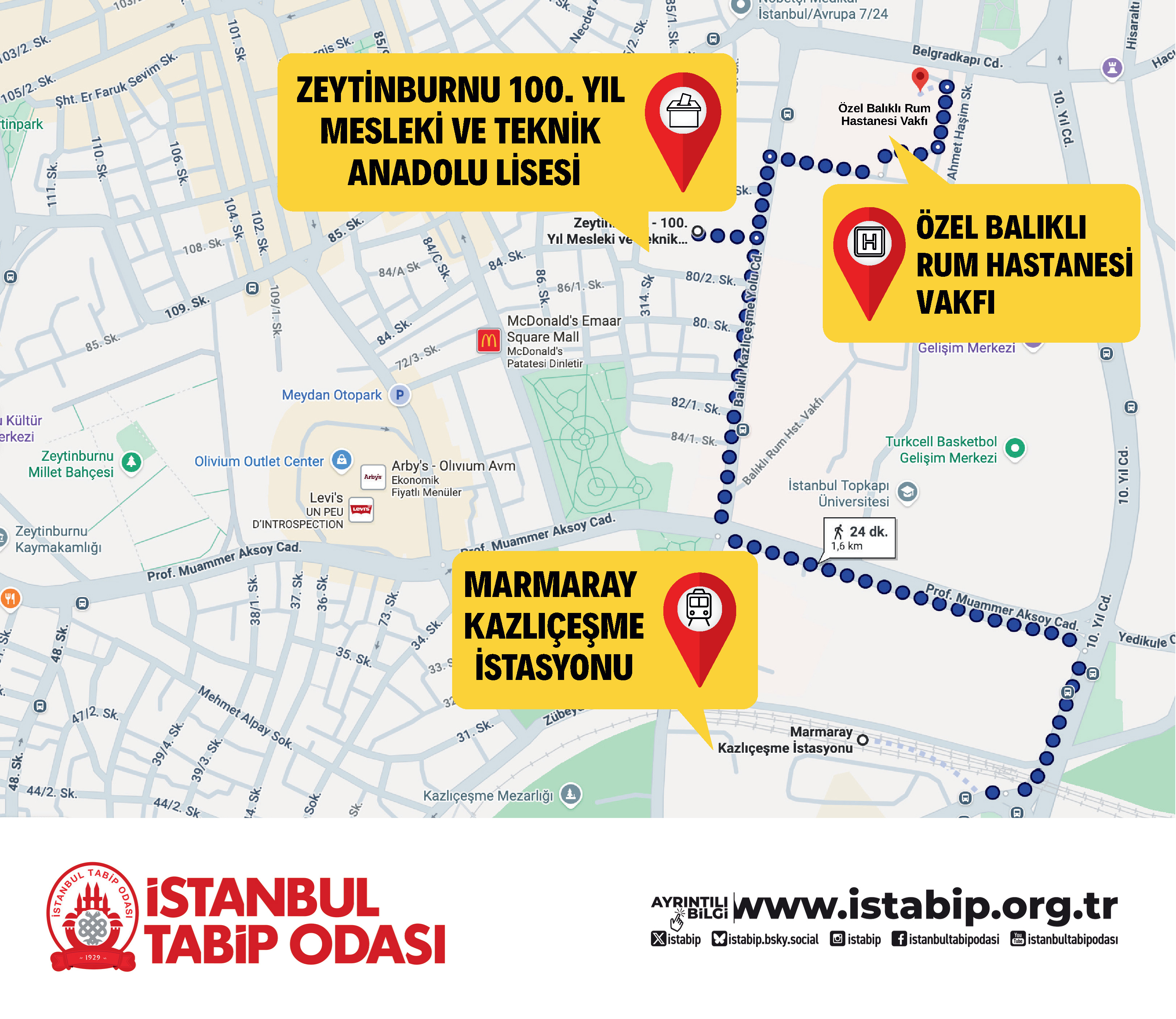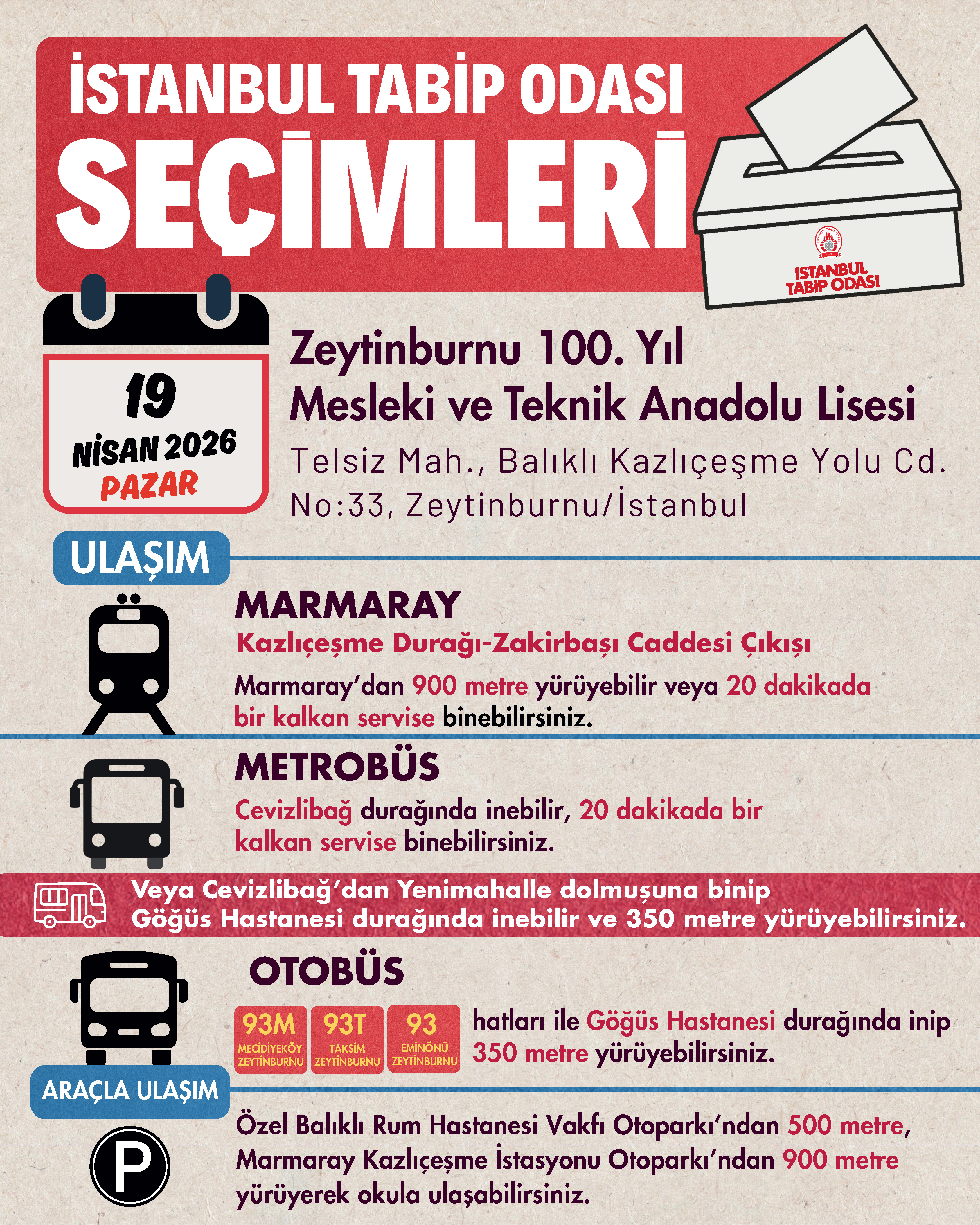İstanbul Tabip Odası Yönetim Kurulu; Olağan Seçimli Genel Kurulu’nun 4-5 Nisan 2026 tarihlerinde İstanbul Tabip Odası binasında (Avrupa Konutları Kale Ofis - Maltepe Mahallesi, Londra Asfaltı Caddesi, No:2, Kat:4, Daire:20, Cevizlibağ / Zeytinburnu / İstanbul) yapılmasına karar vermiştir.