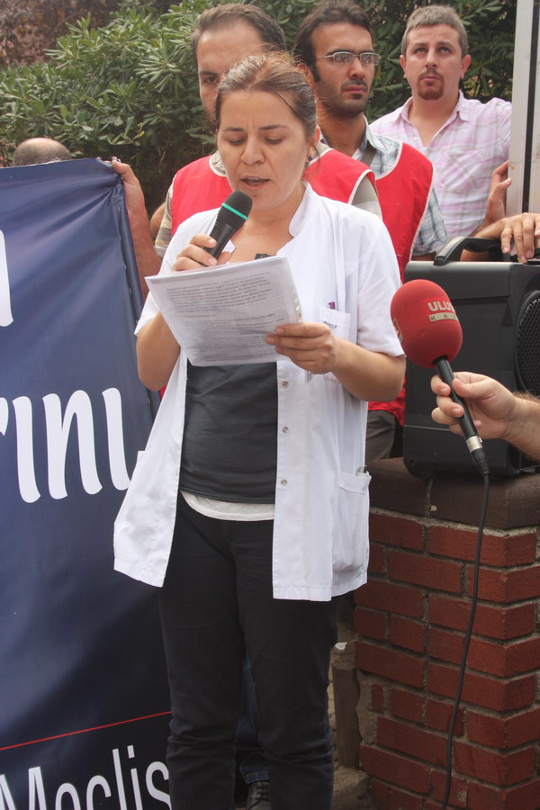 Yapılan konuşmaların ardından, İstanbul Tabip Odası, Dev Sağlık-İş ve SES Aksaray Şubesi adına ortak açıklamayı İstanbul Tabip Odası Yönetim Kurulu Üyesi As. Dr. Feray Kaya okudu. Samsun OMÜ'de Asistan Dr. Mustafa Bilgiç'in ölümüne değinilen açıklamada, aralıksız 33 saat çalışmanın ve haftalık 120 saate varan çalışmanın yarattığı sonuçların kaza veya hata olarak değerlendirilemeyeceğini söyledi.