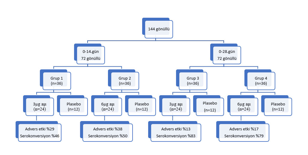 16 Nisan ile 25 Nisan arasında Faz I’de 144 gönüllü 0-14. gün (n=72) ve 0-28. Gün (n=72) şeklinde iki farklı gruba randomize ediliyor. Her gruptaki hastalar 36 hastadan iki eşit alt gruba ayrılıyorlar. Böylelikle 36 hastalık 4 alt grup oluşuyor. Bu 36 hastalık gruplar da 2:1 şeklinde aşı grubu ve de plasebo grubuna ayrılıyorlar. Aşı gruplarındaki hastalara 3µg ve 6µg dozunda aşı uygulanıyor. Adverse etki ve serokonversiyon ve de gruplar arası değişim aşağıdaki şekildeki gibi oluyor.