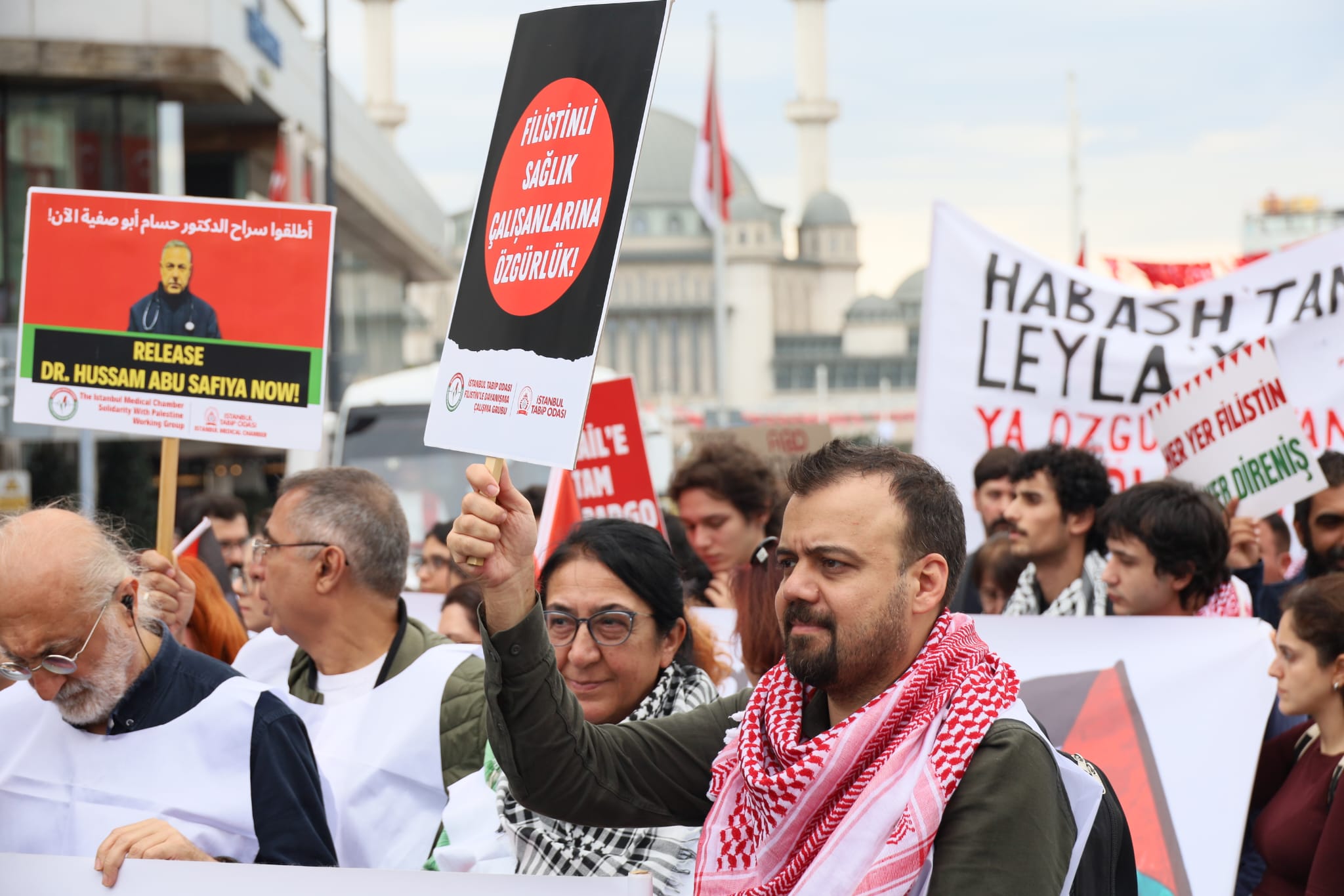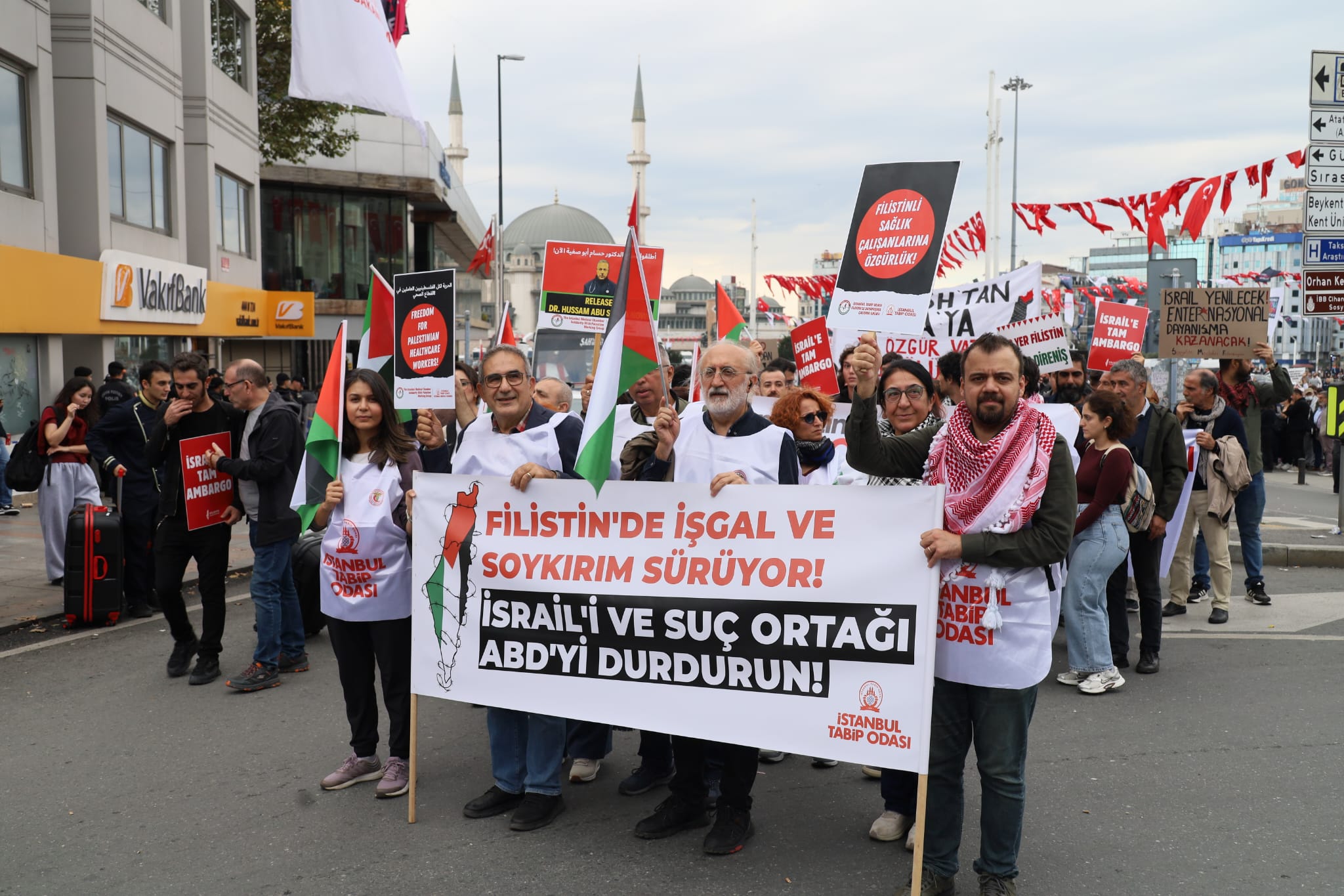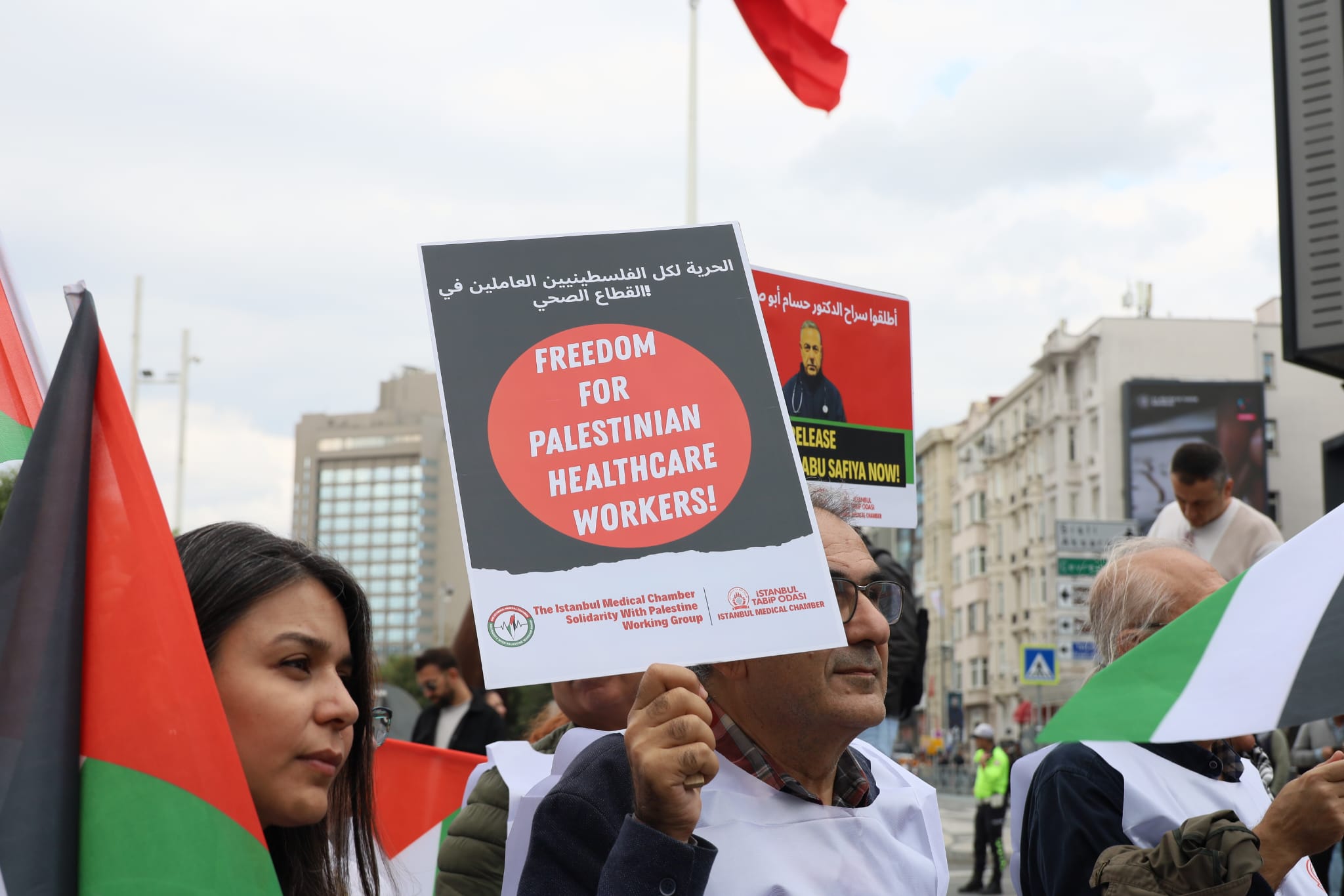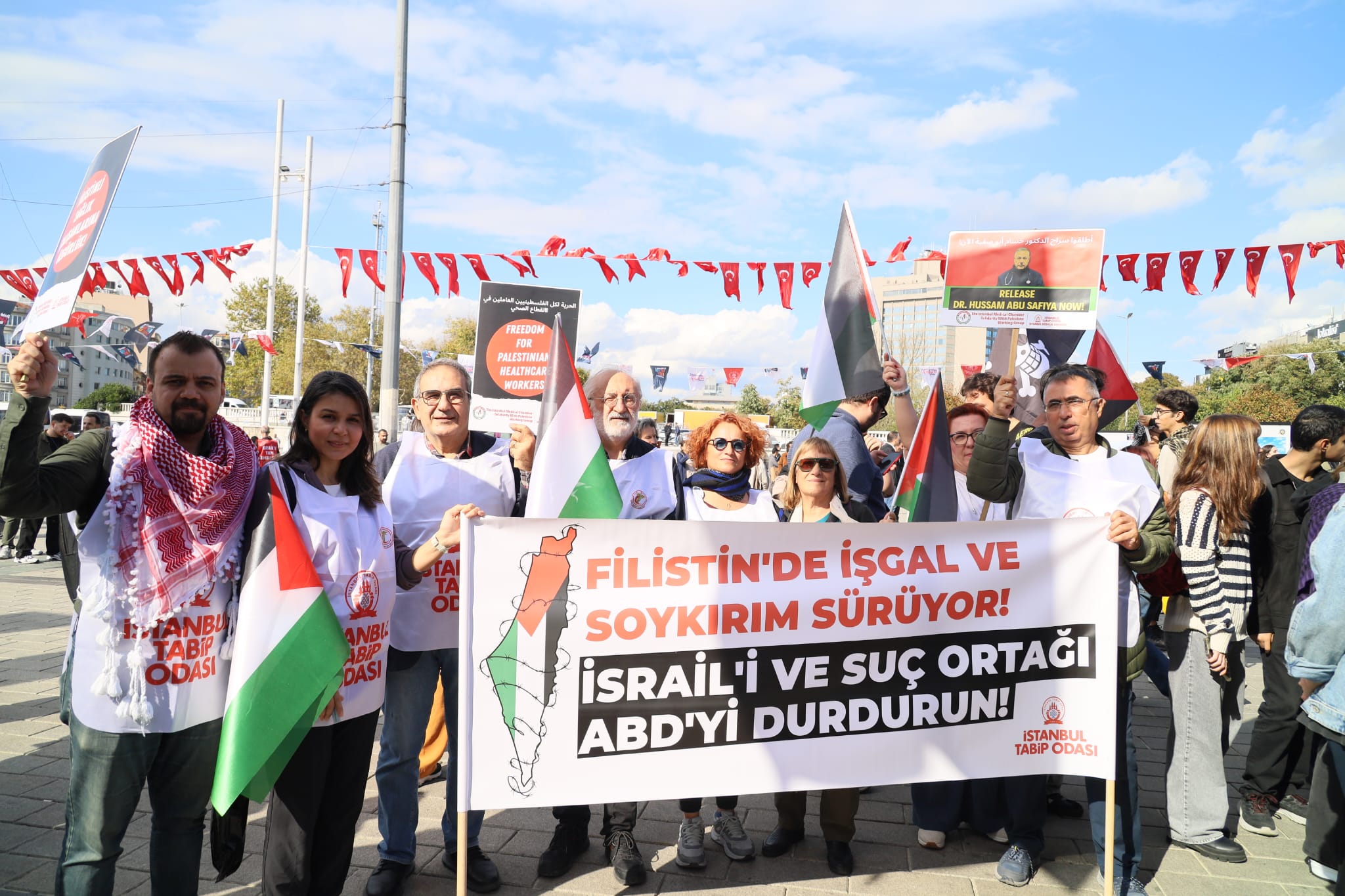 5 Ekim 2025 tarihinde düzenlenen yürüyüşe İstanbul Tabip Odası (İTO) olarak kortejimizle katıldık. Kortejimiz “Filistin’de işgal ve soykırım sürüyor! İsrail’i ve suç ortağı ABD’yi durdurun!” pankartı ile yürüdü. Yürüyüş sırasında Filistin bayraklarının yanı sıra 2025 yılı İTO Dişhekimi Sevinç Özgüner İnsan Hakları, Barış ve Demokrasi Ödülü sahibi Dr. Hussâm Ebu Safiyye’ye ve tüm tutsak Filistinli sağlık çalışanlarına özgürlük talebini dile getiren dövizler taşındı. Kortejde İTO Yönetim Kurulu Başkanı Dr. Osman Küçükosmanoğlu, Genel Sekreter Dr. Ertuğrul Oruç ile çok sayıda İTO üyesi doktor yer aldı.