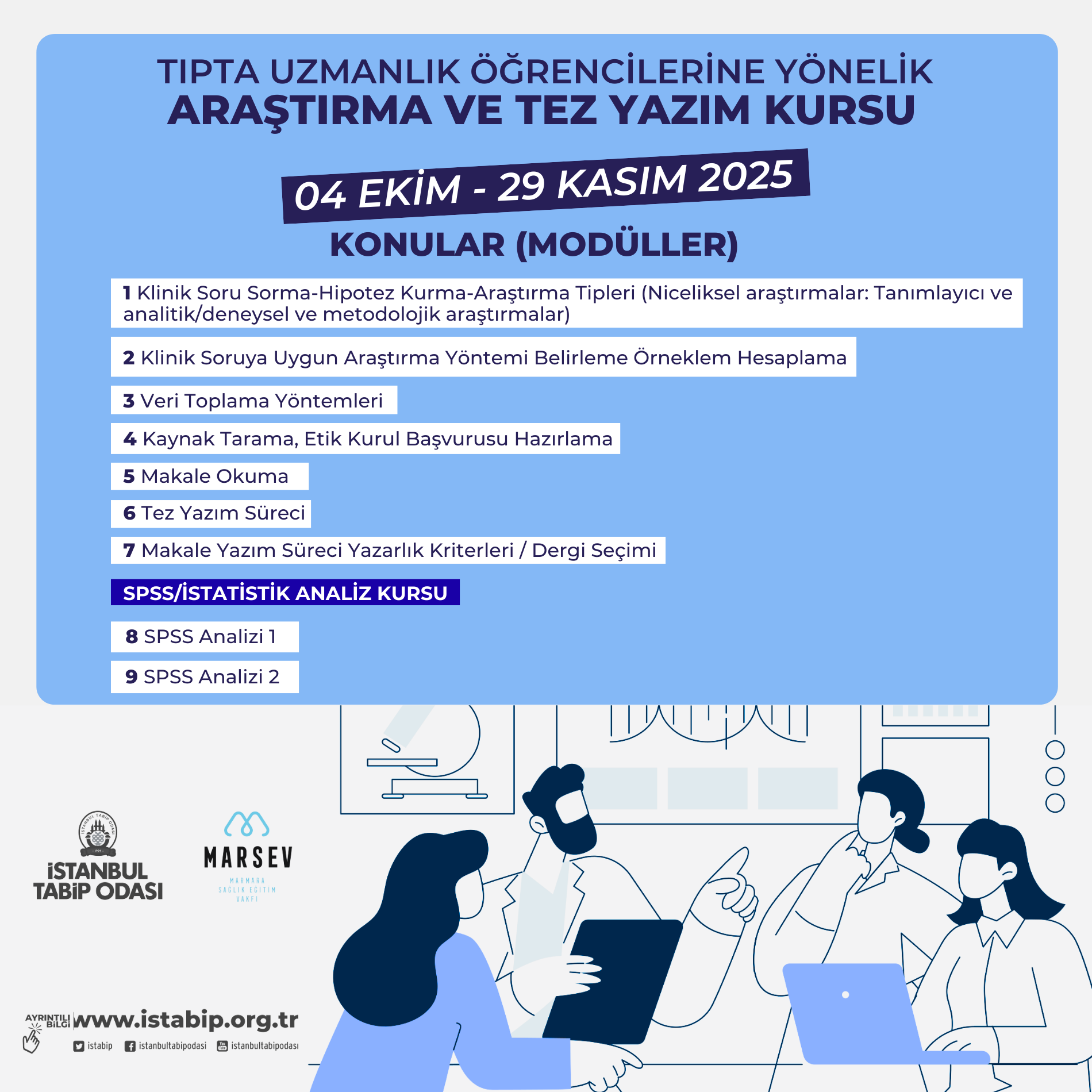 Tıpta Uzmanlık Öğrencilerine Yönelik Araştırma ve Tez Yazım Kursu, 4 Ekim-29 Kasım 2025 tarihlerinde, 09.00-13.00 saatleri arasında Odamızın Cevizlibağ Merkez Bürosu’nda yapılacaktır. (Avrupa Konutları Kale Ofis Maltepe Mah. Londra Asfaltı Cd. No:2, Kat 4, Daire 20, Cevizlibağ – Zeytinburnu)