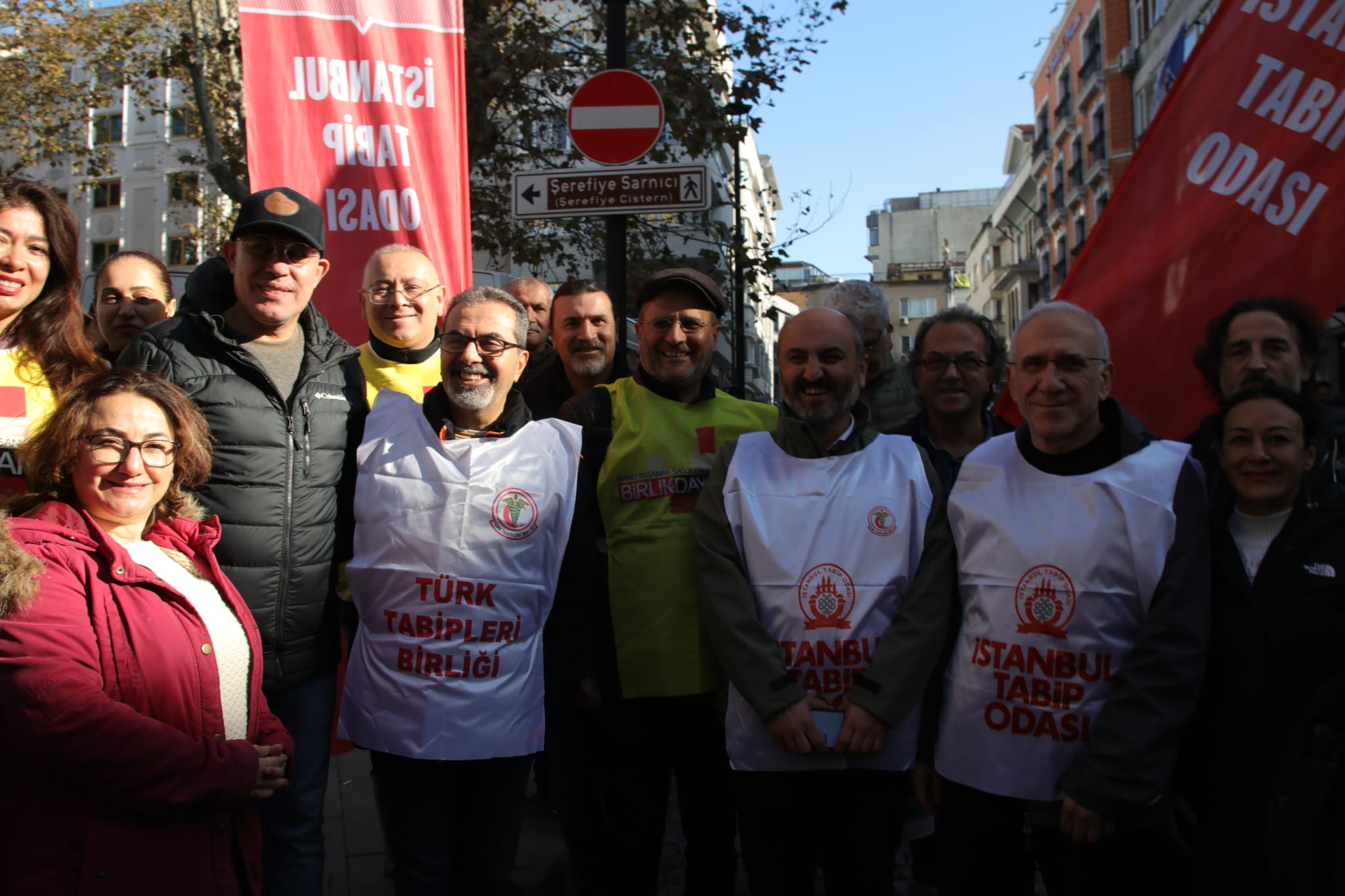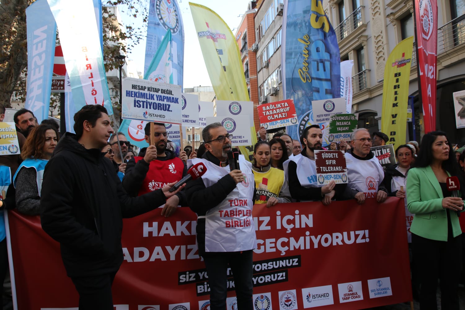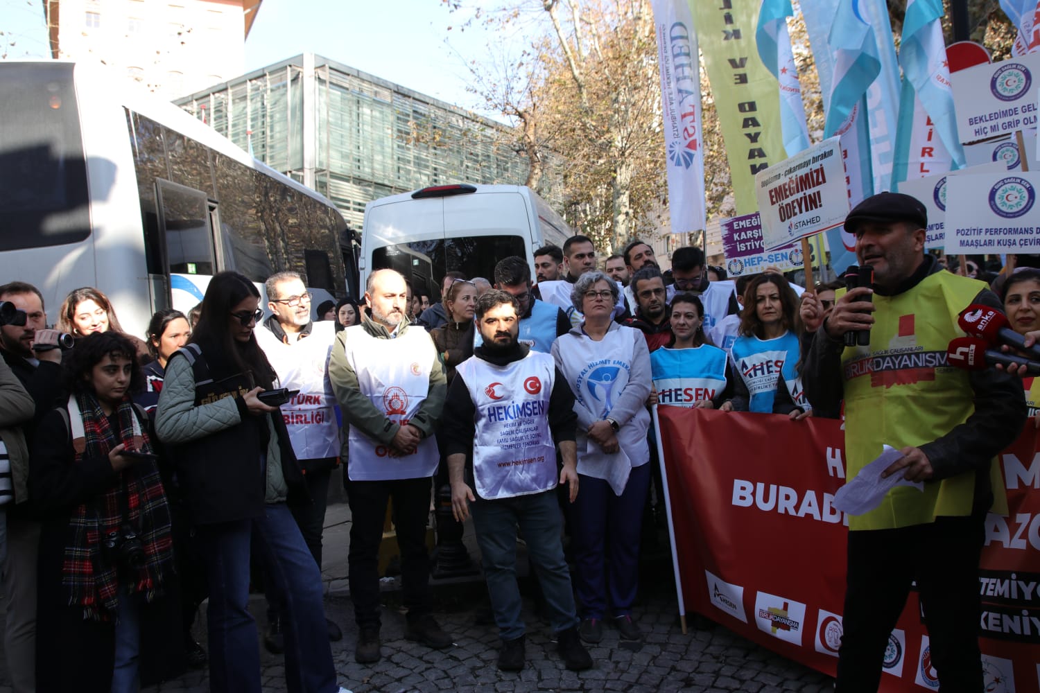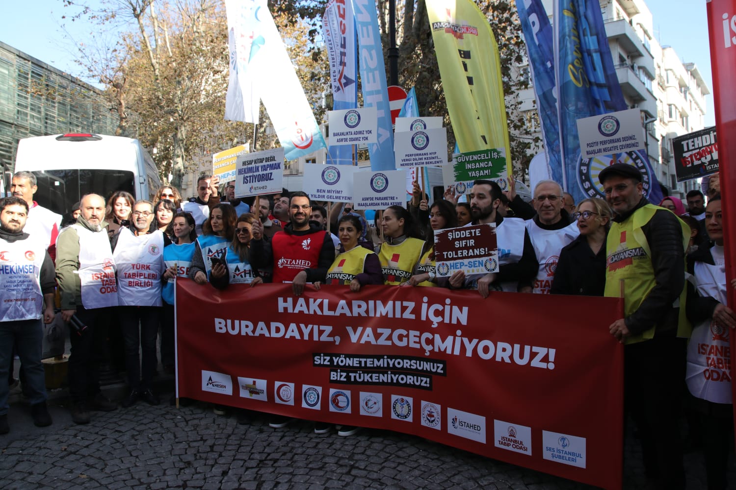 Verdiğiniz sözlerin birini bile gerçekleştirmediniz. Bizi de bu düzenin bir parçası haline getirmek için baskı ve cezalarınızla tüm gücünüzle saldırdınız. Ancak biz kendimize ve hastalarımıza verdiğimiz sözle, mesleğimizin onurunu korumak için, sağlığa ve mesleğimize yaptığınız bu saldırılara karşı bugün buradayız. Doğru bildiğimiz işimizi düzgün bir şekilde yapabilmek, halkımızın sağlığını koruyabilmek için mücadelemize devam edeceğiz.