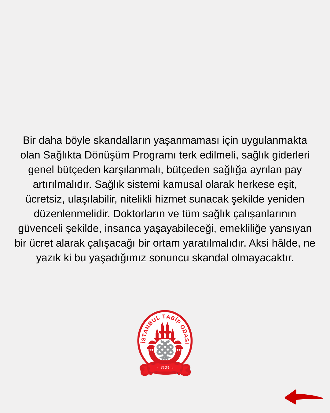 Bir daha böyle skandalların yaşanmaması için uygulanmakta olan Sağlıkta Dönüşüm Programı terk edilmeli, sağlık giderleri genel bütçeden karşılanmalı, bütçeden sağlığa ayrılan pay artırılmalıdır. Sağlık sistemi kamusal olarak herkese eşit, ücretsiz, ulaşılabilir, nitelikli hizmet sunacak şekilde yeniden düzenlenmelidir. Doktorların ve tüm sağlık çalışanlarının güvenceli şekilde, insanca yaşayabileceği, emekliliğe yansıyan bir ücret alarak çalışacağı bir ortam yaratılmalıdır. Aksi hâlde, ne yazık ki bu yaşadığımız sonuncu skandal olmayacaktır.