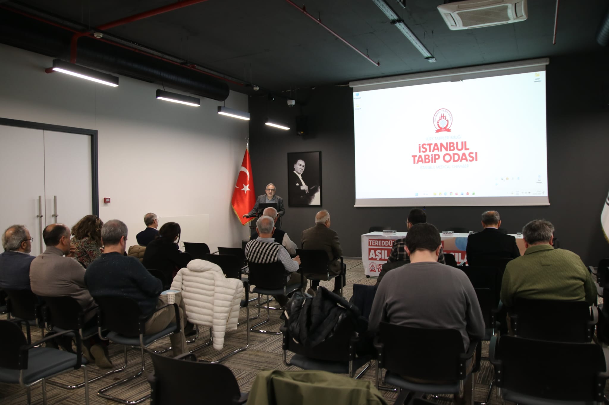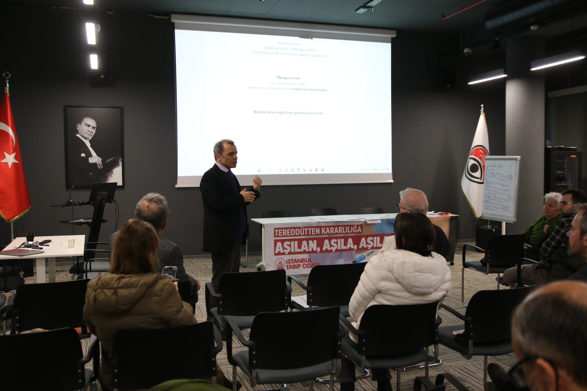 Türk Tabipleri Birliği Merkez Konsey Başkanı Dr. Alpay Azap ve İstanbul Tabip Odası Yönetim Kurulu Başkanı Dr. Osman Küçükosmanoğlu’nun konuşma yaptığı toplantıda aşı tereddüdünün günümüzde hekim–hasta ilişkisinin en hassas ve en zorlayıcı başlıklarından biri haline geldiği vurgulandı.