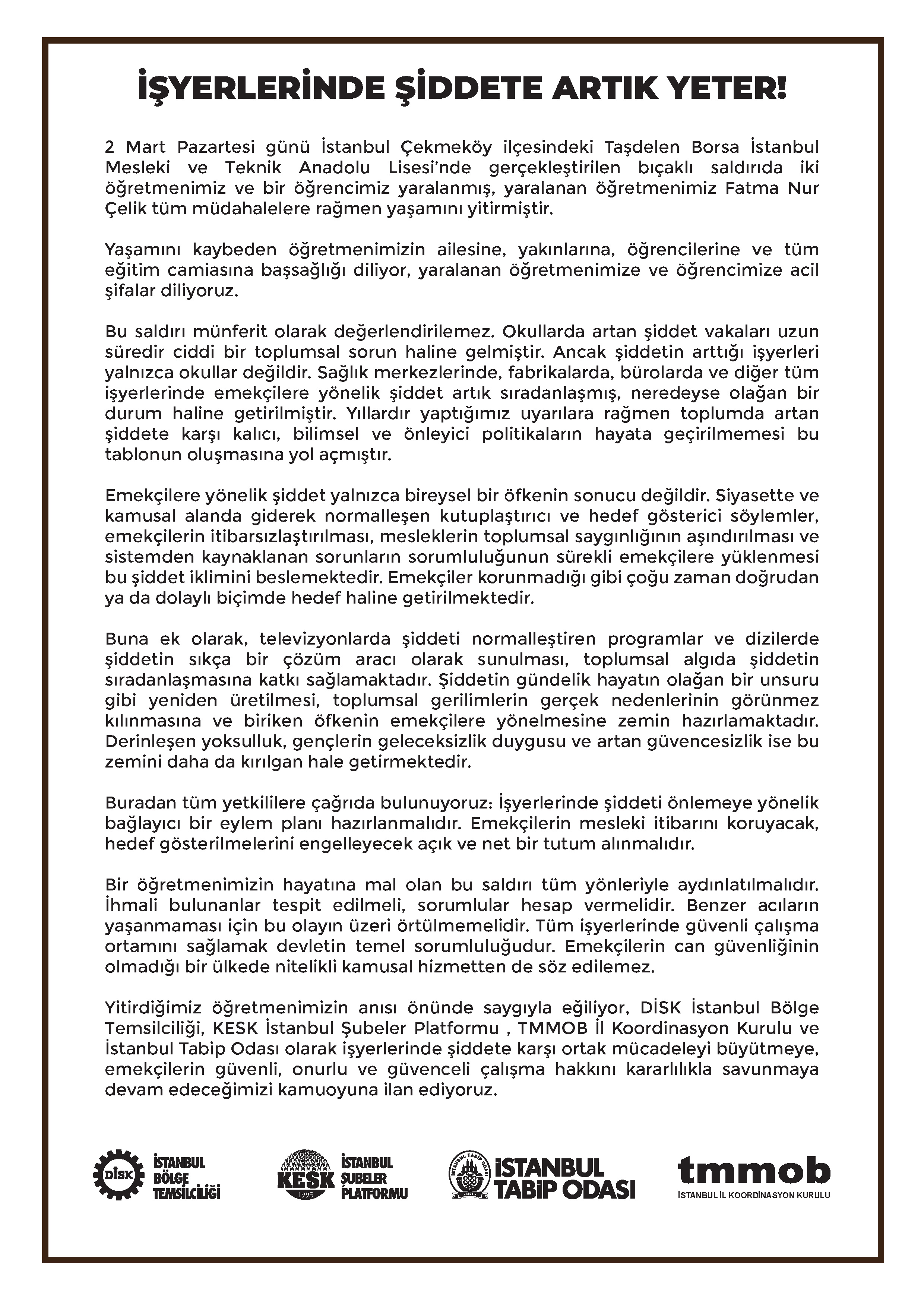 Yitirdiğimiz öğretmenimizin anısı önünde saygıyla eğiliyor, DİSK İstanbul Bölge Temsilciliği, KESK İstanbul Şubeler Platformu , TMMOB İl Koordinasyon Kurulu ve İstanbul Tabip Odası olarak işyerlerinde şiddete karşı ortak mücadeleyi büyütmeye, emekçilerin güvenli, onurlu ve güvenceli çalışma hakkını kararlılıkla savunmaya devam edeceğimizi kamuoyuna ilan ediyoruz.