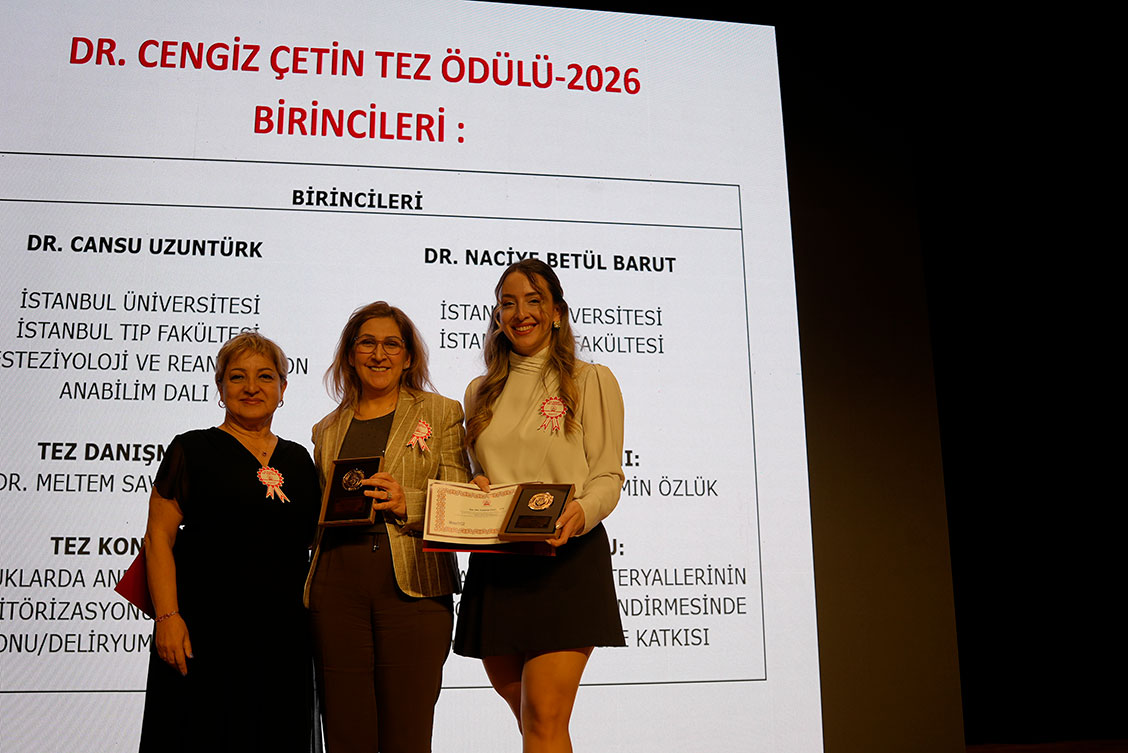 2026 yılı Dr. Cengiz Çetin Tez Ödülü’nde birincilik, “Çocuklarda Anestezi Derinlik Monitörizasyonunun Uyanma Ajitasyonu/Deliryum Üzerine Etkisi” başlıklı tezi ile İstanbul Üniversitesi İstanbul Tıp Fakültesi Anesteziyoloji ve Reanimasyon Anabilim Dalı’ndan Dr. Cansu Uzuntürk ve "Mesane Kanseri TUR Materyallerinin Histopatolojik Değerlendirmesinde Yapay Zekanın Rutine Katkısı" başlıklı tezi ile İstanbul Üniversitesi İstanbul Tıp Fakültesi Patoloji Anabilim Dalı’ndan Dr. Naciye Betül Barut'un oldu.