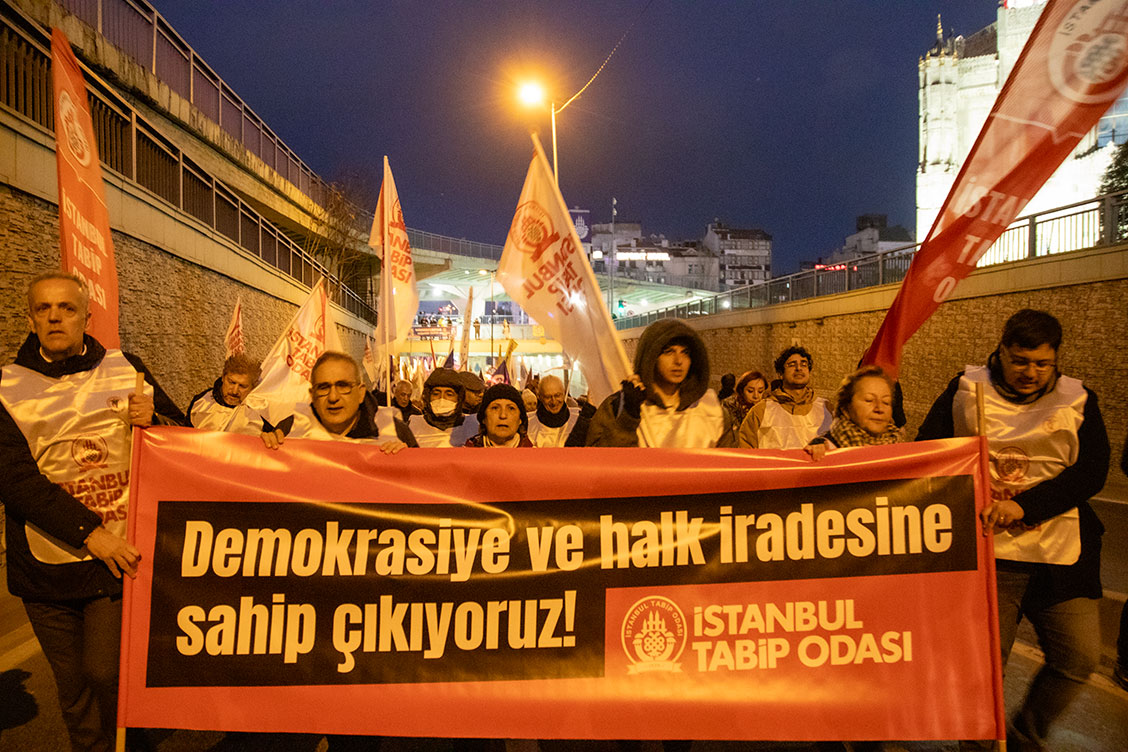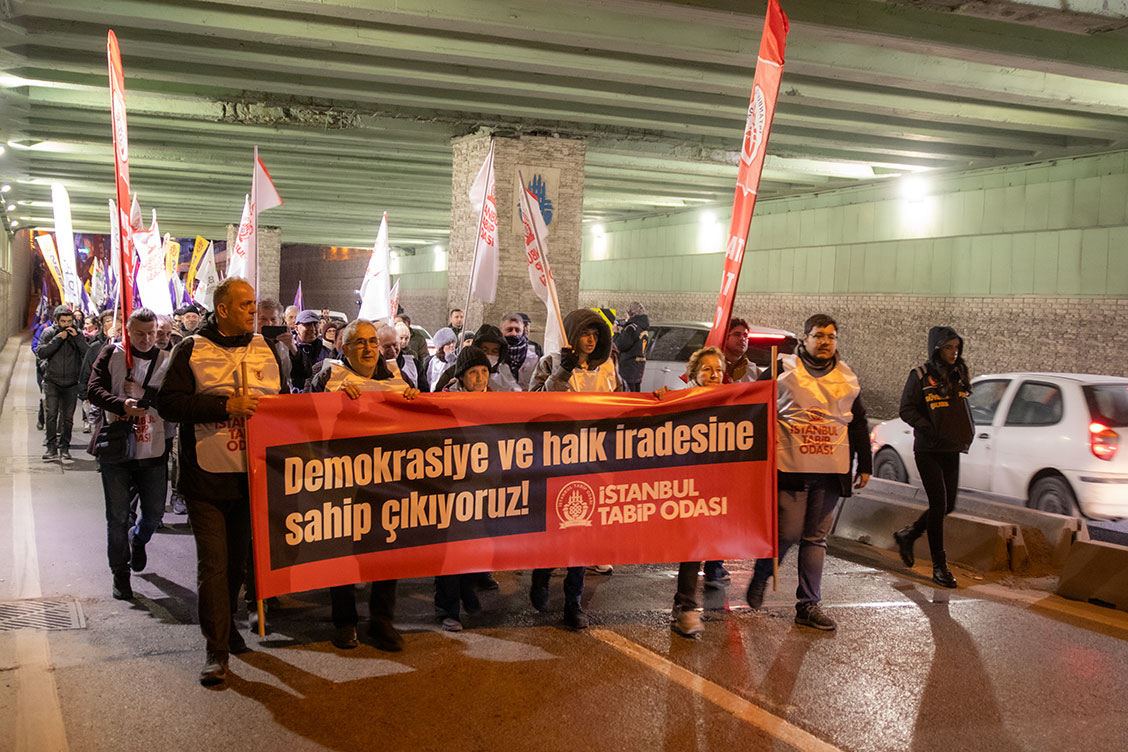 Hekimler, 18 Mart 2026 tarihinde Yenikapı'da buluşarak Saraçhane mitingine katılmak için yürüyüşe geçti. Yürüyüşte "Demokrasi ve Halk İradesine Sahip Çıkıyoruz" pankartı taşındı.