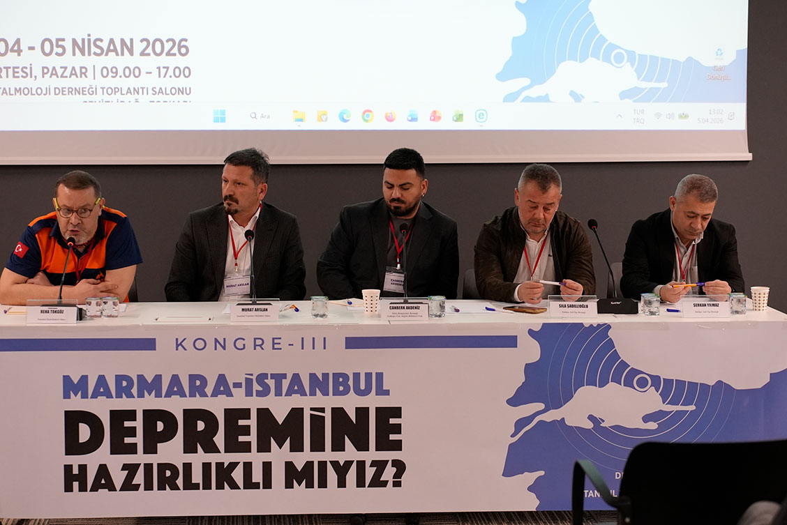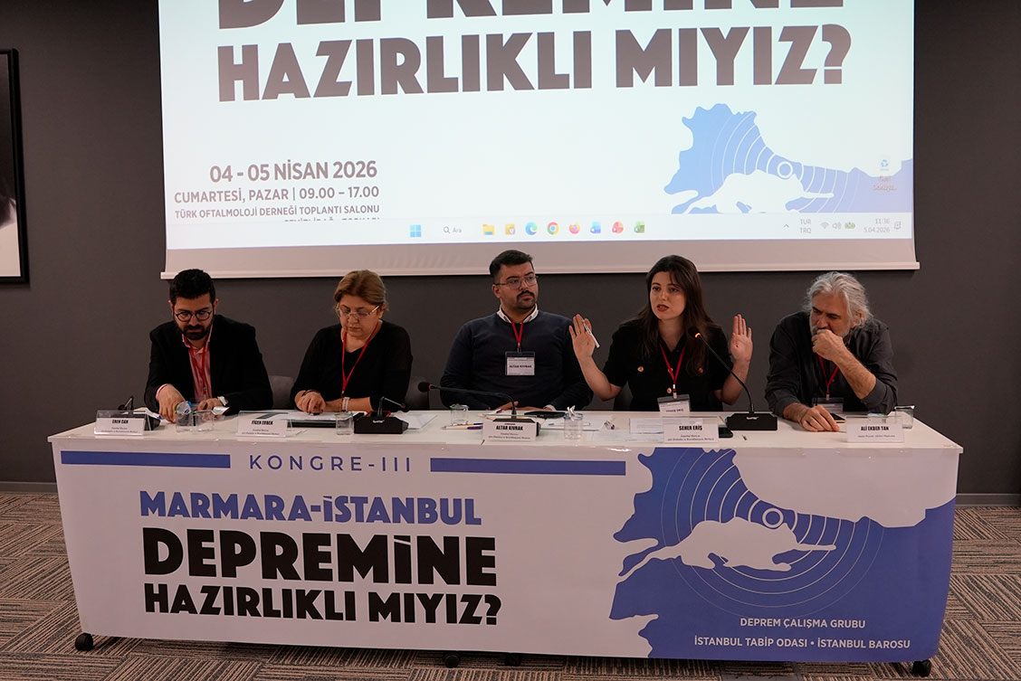 İstanbul Tabip Odası Deprem Çalışma Grubu ve İstanbul Barosu’nun birlikte düzenlediği “Marmara-İstanbul Depremine Hazırlıklı mıyız?” başlıklı kongre 4-5 Nisan 2026 tarihlerinde Türk Oftalmoloji Derneği’nin toplantı salonunda yapıldı. Marmara-İstanbul depremine karşı bütünleşik afet yönetiminin ve bu kapsamda toplumun ve bireylerin üzerine düşen sorumlulukların tartışıldığı kongrenin açılış konuşmalarını İstanbul Tabip Odası Genel Sekreteri Dr. Ertuğrul Oruç, Deprem Çalışma Grubu Yürütme Kurulu’ndan Dr. Hasan Oğan ve İstanbul Barosu Başkanı Av. İbrahim Özden Kaboğlu yaptı.