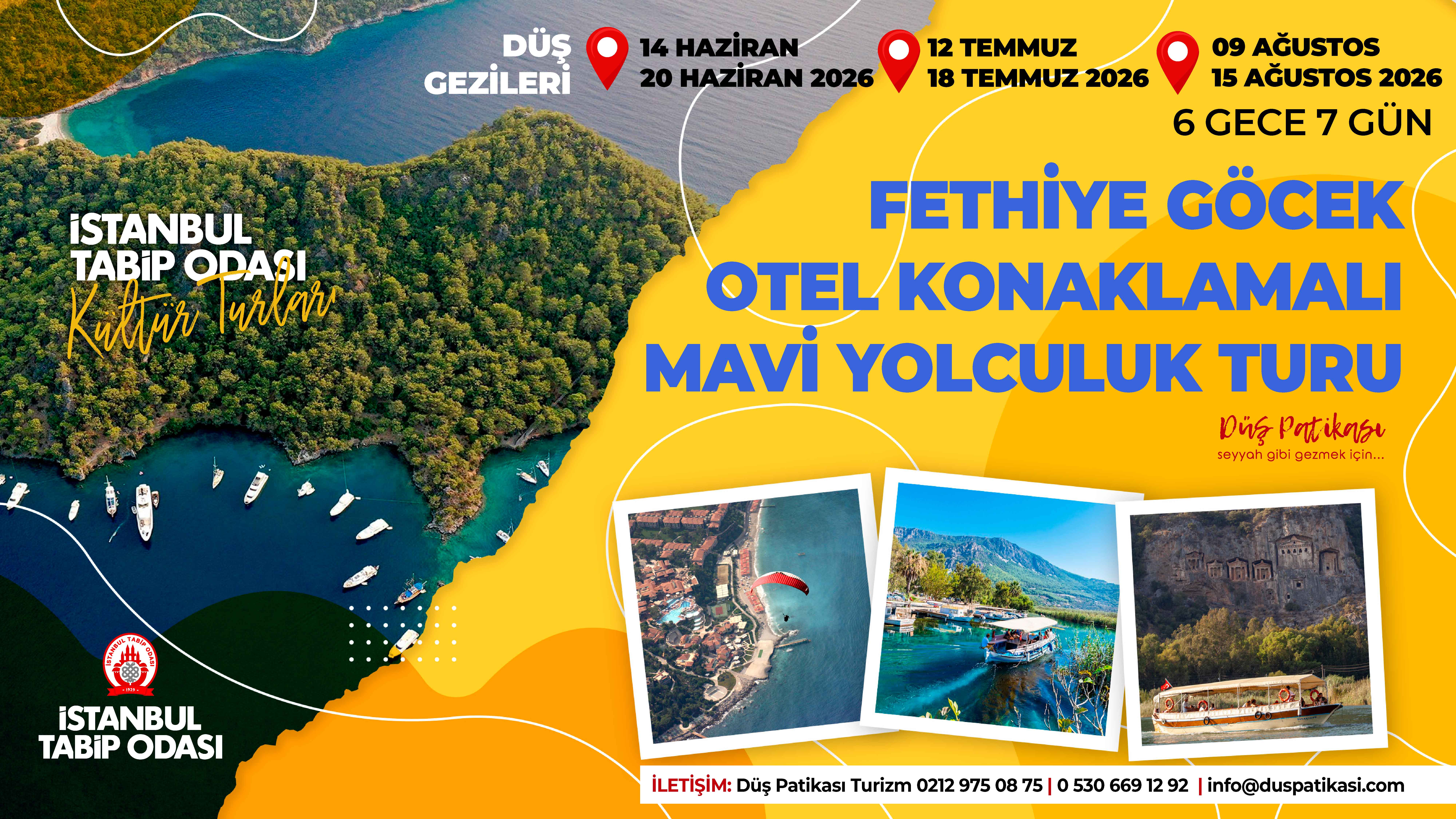 Fethiye Göcek Turumuz; tatil denilince ilk akla gelen masmavi denizden, yemyeşil doğaya uzanan; deniz, keyif, doğa. Turumuz ‘’otel konaklamalı mavi yolculuk’’ konseptindedir. Dalyan'da konaklayarak başlayacağımız tatilimiz tekne turu ile bütünleşmiştir. Fethiye tekne turu veya Göcek tekne turu denilince akla gelen en güzel ve en ünlü manzaralar, bakir bölgeler, birbirinden güzel masmavi koylar, deniz ve yüzme keyfi sizi beklemekte. Her gün başka bir tur rotası içeren, 6 günü tekne turu olarak geçen tatilimizde, gündüzleri sadece siz misafirlerimize özel butik max. 22 kişilik teknemiz ile doğanın içerisinde, antik kentler görecek, doğal güzelliği ile ünlü koylarda yüzüp denizin keyfine varacağız. Akşamları ise, Göcek, Fethiye, Dalyan vb. yerlerde gezip eğleneceğiz. Küçük grup olarak yapacağımız bu mavi turumuzda keyif, tatil, dinlence, eğlence ve doğa güzellikleri sizi bekliyor.
